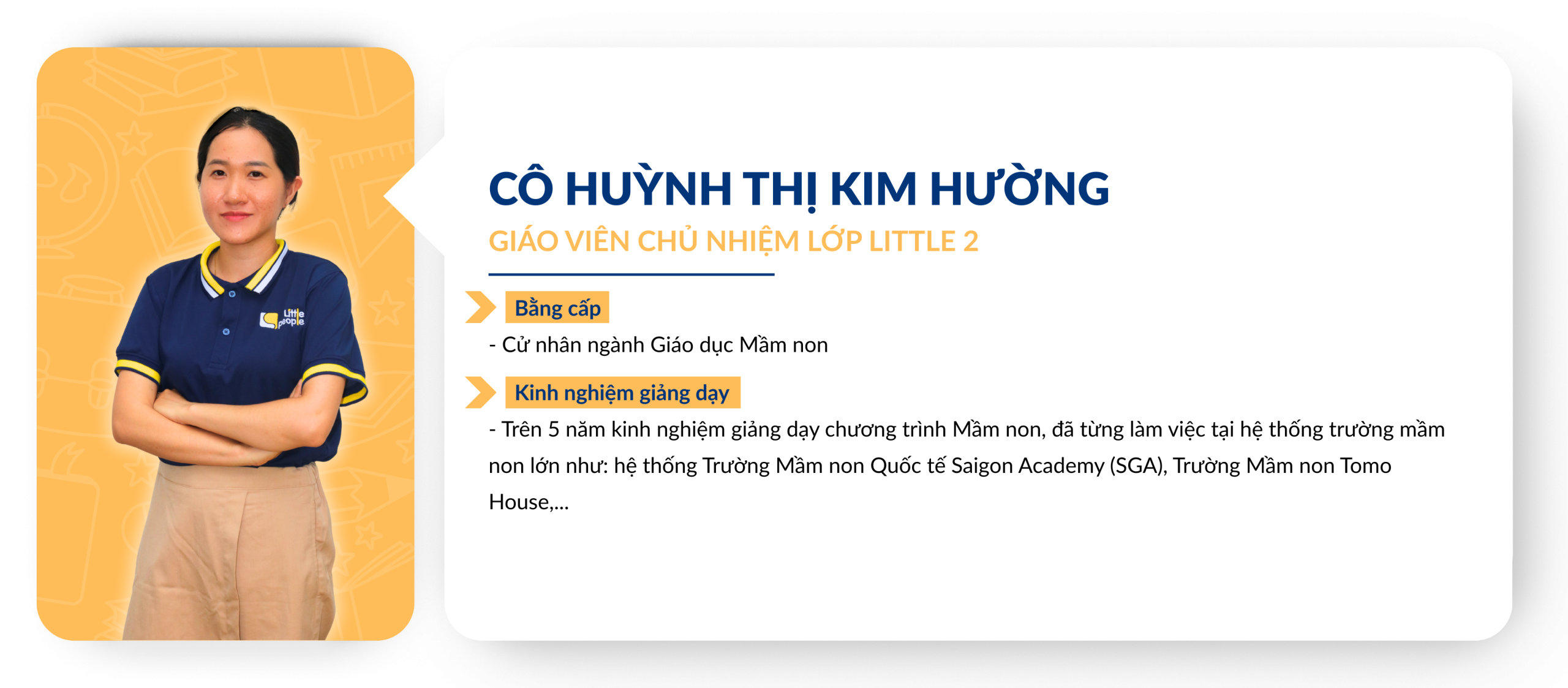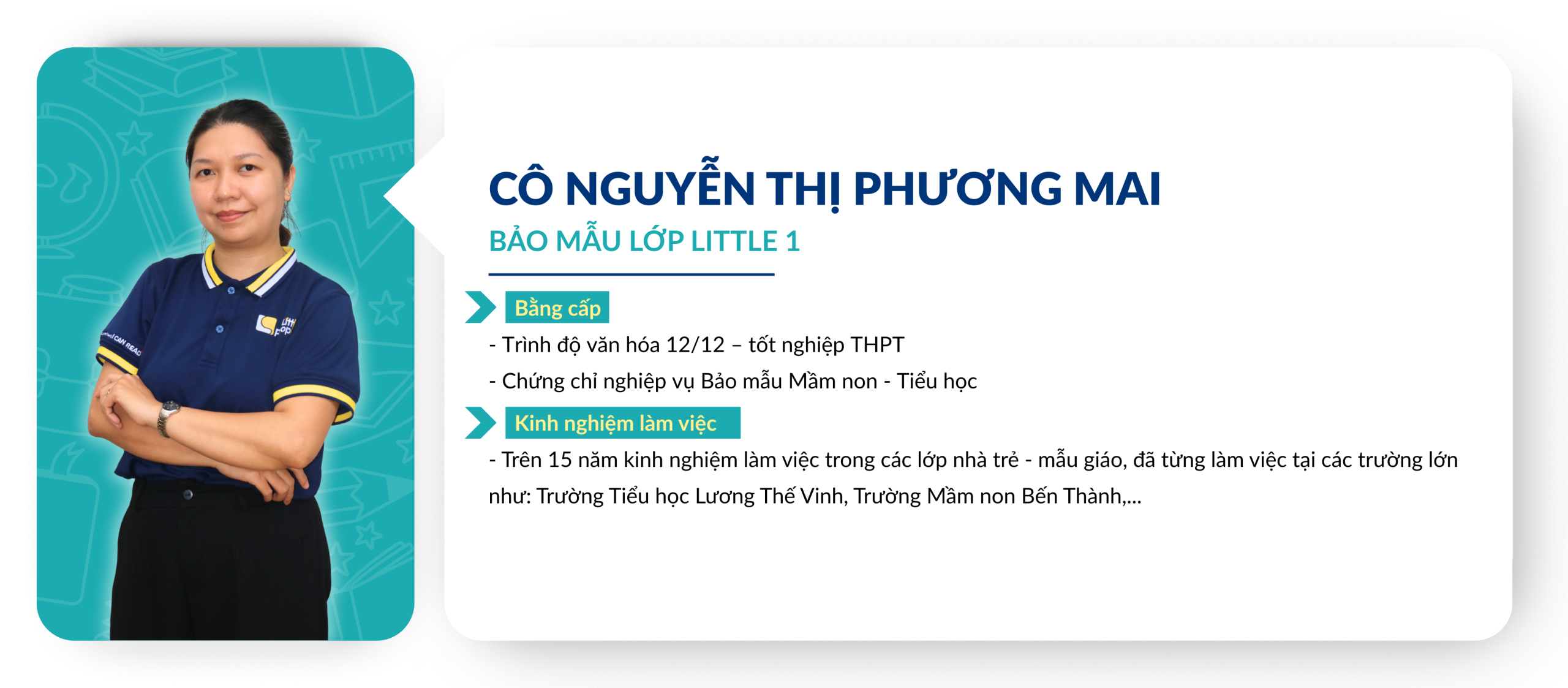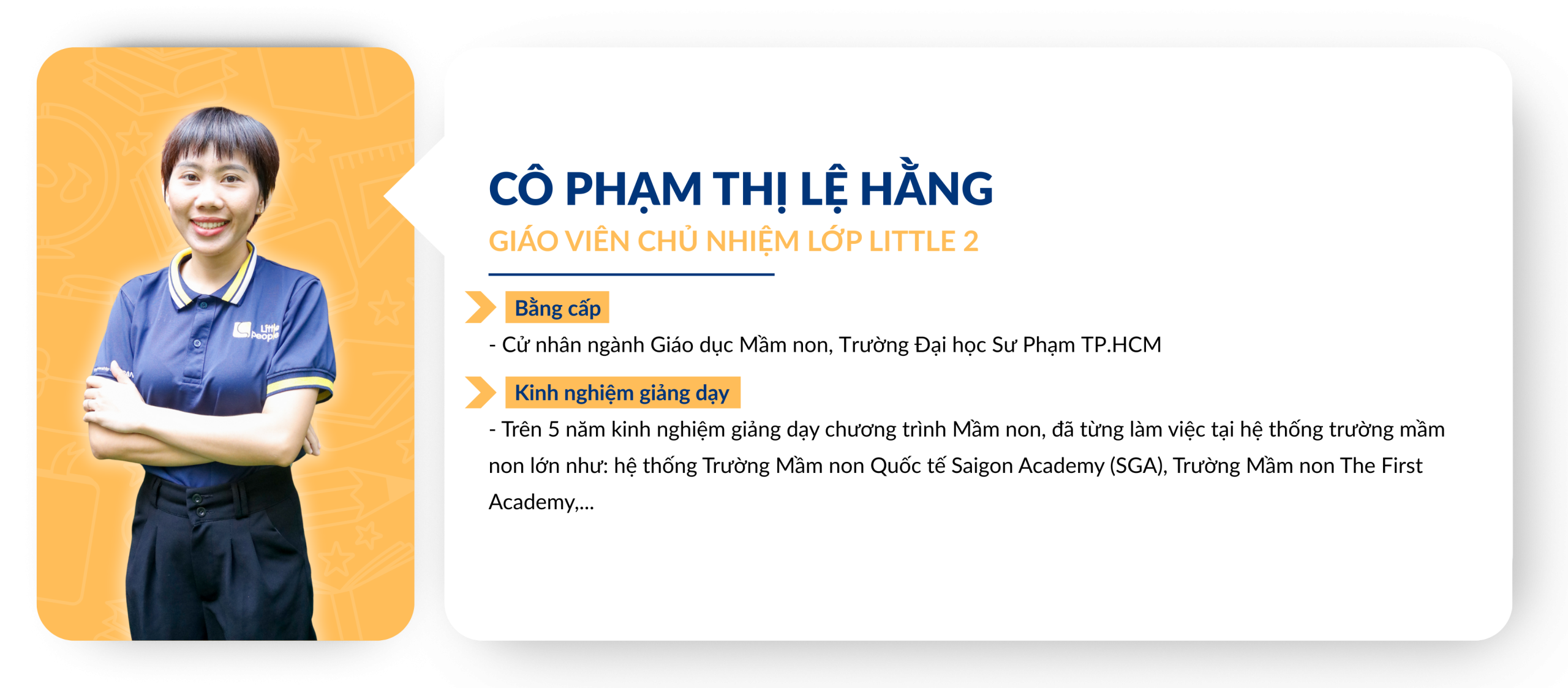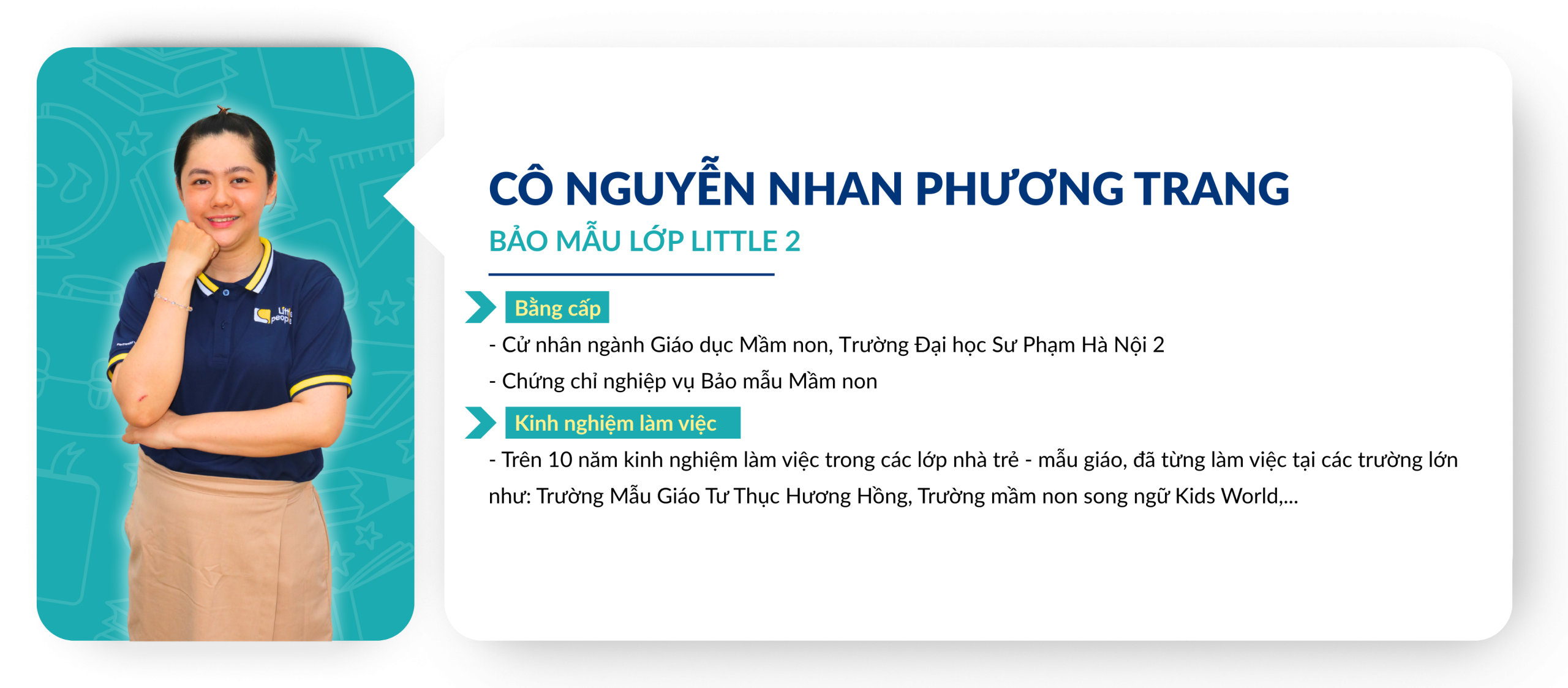 Chuẩn mực về tuyển dụng và đào tạo Giáo viên: Giáo viên ứng tuyển vào Little People Kingdom luôn được yêu cầu thực hiện tiết dạy thử để Ban Giám Hiệu đánh giá trình độ chuyên môn từ đó lên kế hoạch đào tạo sau khi chính thức gia nhập đội ngũ Giáo viên của nhà trường. Việc xây dựng và duy trì một đội ngũ Giáo viên đủ chuẩn về bằng cấp và năng lực giảng dạy là một thử thách đòi hỏi sự đầu tư nghiêm túc từ Ban điều hành. Trong những năm qua, Little People luôn được các cơ quan chủ quản đánh giá cao về chuẩn năng lực dành cho đội ngũ, tuân thủ đúng các qui định của Bộ Giáo dục về bằng cấp chuẩn của các Giáo viên đứng lớp.