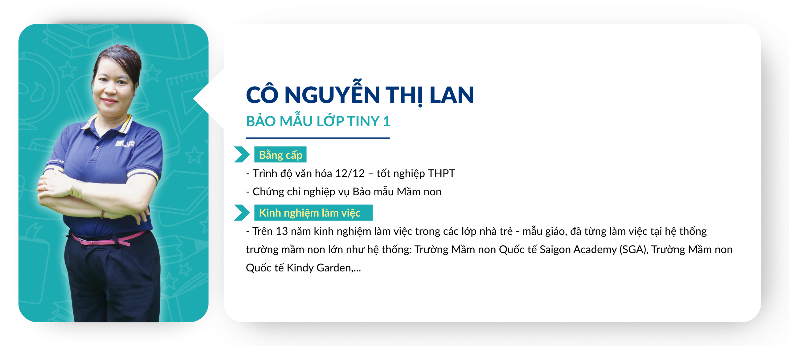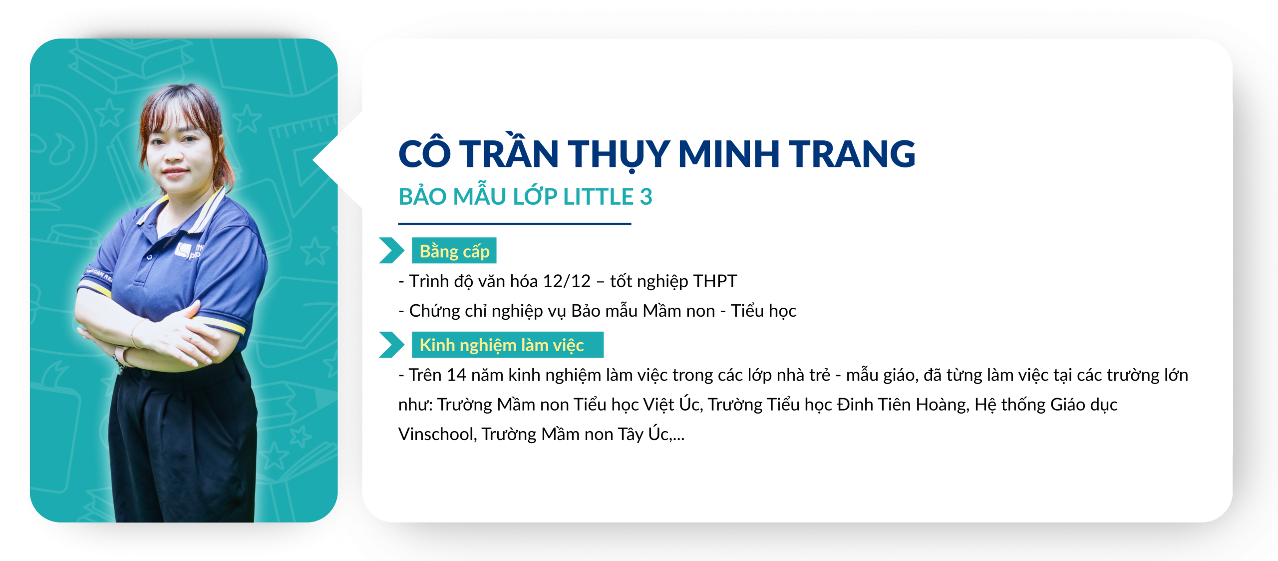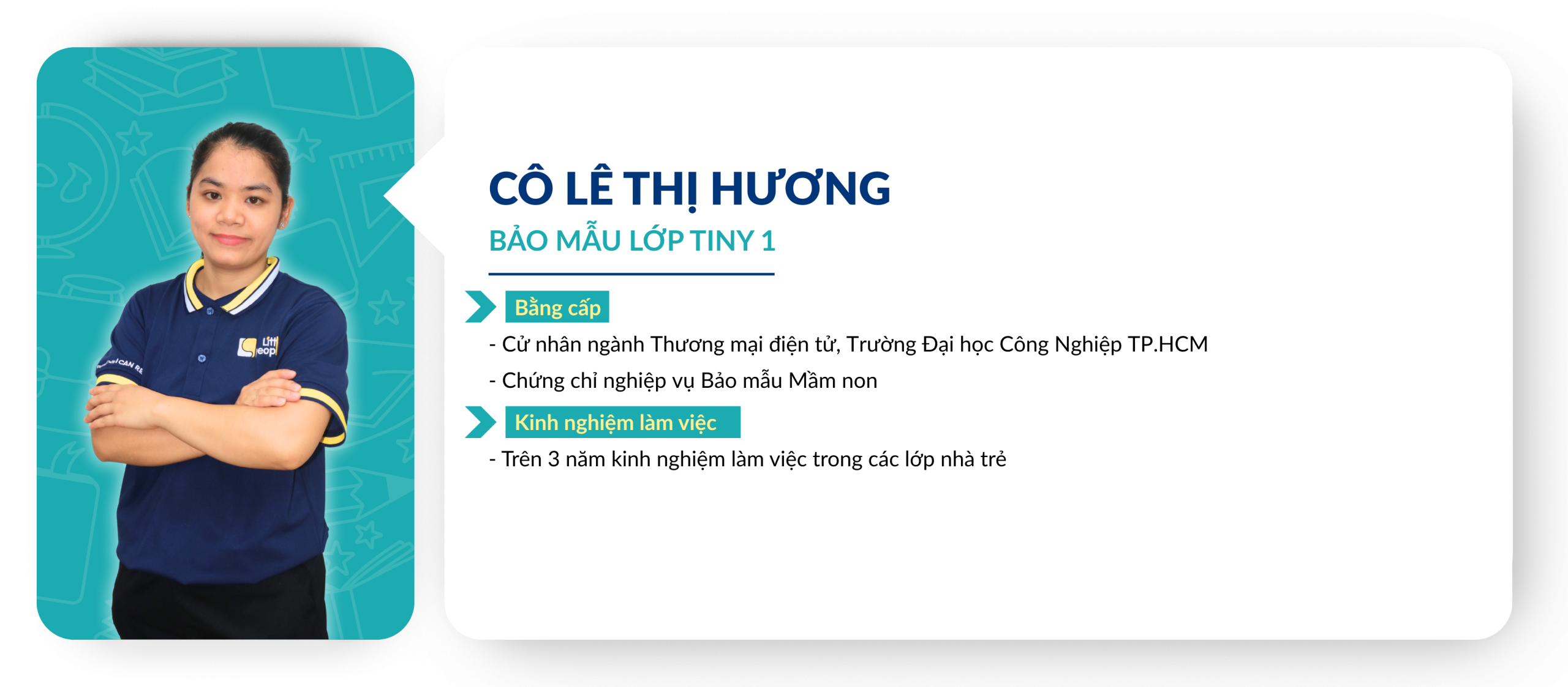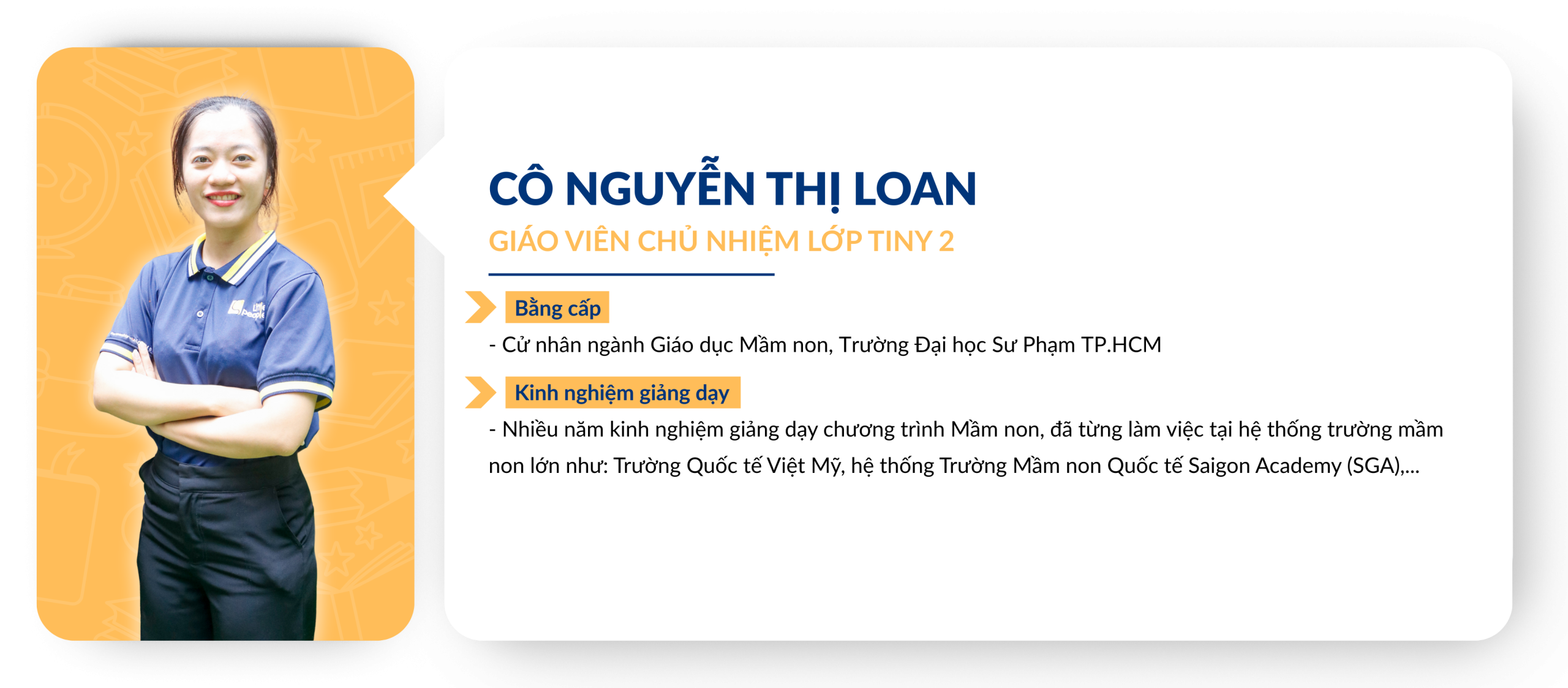 Chuẩn mực về tuyển dụng và đào tạo Giáo viên: Giáo viên ứng tuyển vào Little People Kingdom luôn được yêu cầu thực hiện tiết dạy thử để Ban Giám Hiệu đánh giá trình độ chuyên môn từ đó lên kế hoạch đào tạo sau khi chính thức gia nhập đội ngũ Giáo viên của nhà trường. Việc xây dựng và duy trì một đội ngũ Giáo viên đủ chuẩn về bằng cấp và năng lực giảng dạy là một thử thách đòi hỏi sự đầu tư nghiêm túc từ Ban điều hành. Trong những năm qua, Little People luôn được các cơ quan chủ quản đánh giá cao về chuẩn năng lực dành cho đội ngũ, tuân thủ đúng các qui định của Bộ Giáo dục về bằng cấp chuẩn của các Giáo viên đứng lớp.