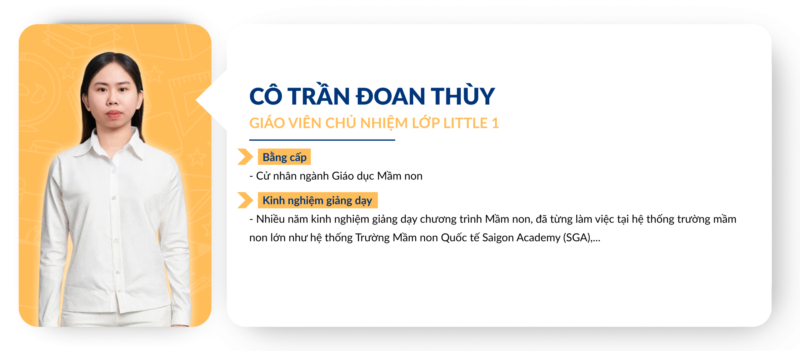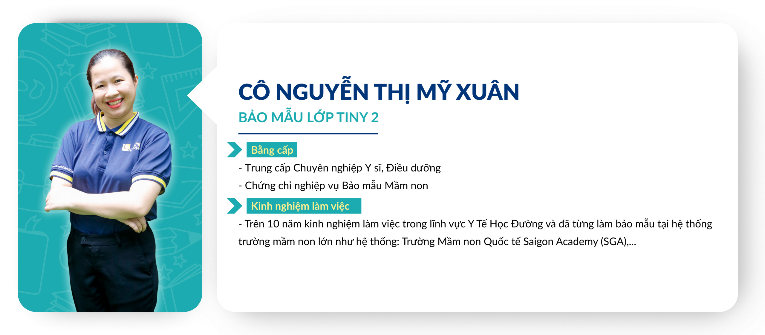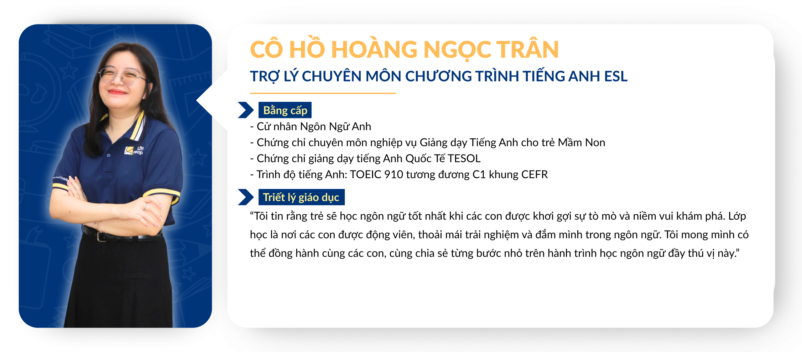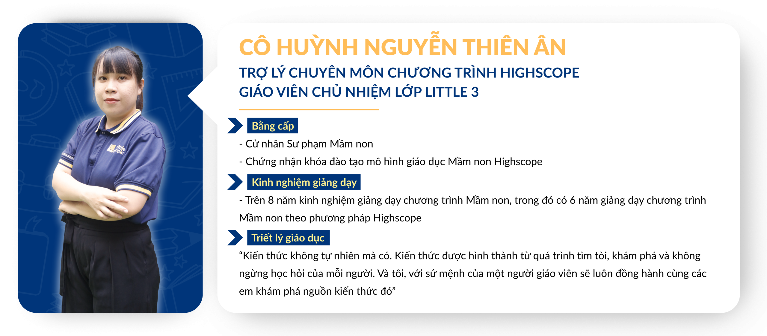 Chuẩn mực về tuyển dụng và đào tạo Giáo viên: Giáo viên ứng tuyển vào Little People Kingdom luôn được yêu cầu thực hiện tiết dạy thử để Ban Giám Hiệu đánh giá trình độ chuyên môn từ đó lên kế hoạch đào tạo sau khi chính thức gia nhập đội ngũ Giáo viên của nhà trường. Việc xây dựng và duy trì một đội ngũ Giáo viên đủ chuẩn về bằng cấp và năng lực giảng dạy là một thử thách đòi hỏi sự đầu tư nghiêm túc từ Ban điều hành. Trong những năm qua, Little People luôn được các cơ quan chủ quản đánh giá cao về chuẩn năng lực dành cho đội ngũ, tuân thủ đúng các qui định của Bộ Giáo dục về bằng cấp chuẩn của các Giáo viên đứng lớp.